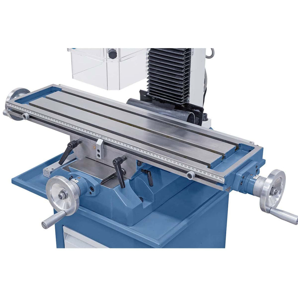La tavola a croce da 700 x 180 mm, con corse di 500 x 215 mm e superficie trattata, garantisce stabilità e precisione. La testa inclinabile ±90° consente fresature angolari, smussi e forature oblique, mentre i cuscinetti di qualità assicurano un’elevata concentricità del mandrino (≤0,015 mm).
