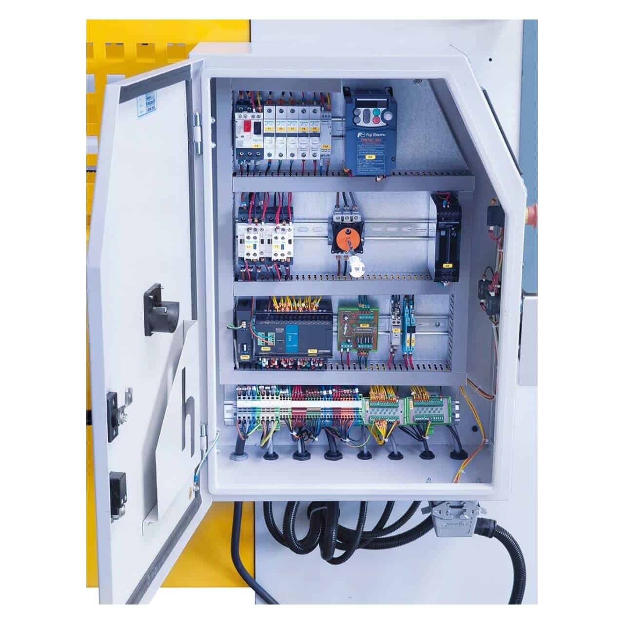 La Bernardo MTR 1100 x 6 mm NCC è una cesoia a ghigliottina motorizzata compatta ma estremamente potente, progettata per il taglio professionale di lamiere fino a 6 mm di spessore (400 N/mm²) e 1100 mm di lunghezza. Dotata di controllo Fuji con touch screen, battuta posteriore NC motorizzata con viti a ricircolo di sfere e sistema pneumatico di supporto lamiera, assicura regolazioni semplici, elevata precisione e stabilità durante il lavoro. L’espulsione della lamiera può avvenire frontalmente o posteriormente, adattandosi a diverse esigenze operative. Le lame superiori e inferiori a doppio tagliente in acciaio temprato garantiscono tagli netti e privi di bave. Con un motore da 7,5 kW, struttura in acciaio saldato e un peso di 2000 kg, la MTR 1100 x 6 mm NCC è ideale per officine e aziende che necessitano di una cesoia compatta, sicura e ad alte prestazioni per tagli gravosi.