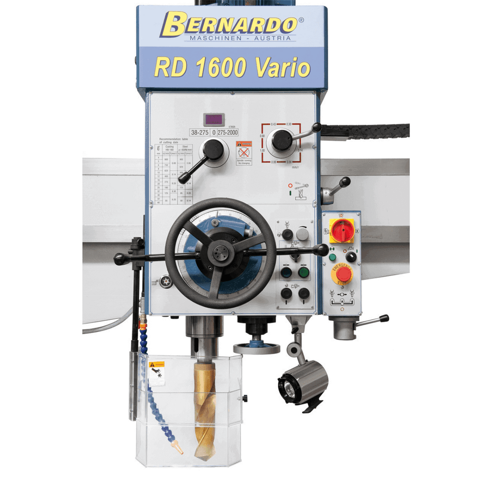 Il trapano radiale Bernardo RD 1600 x 60 Vario è progettato per lavorazioni professionali di foratura, lamatura, alesatura e filettatura fino a M45. Grazie all’inverter di frequenza e al controllo digitale, offre velocità variabile continua (38–2000 rpm) con lettura immediata su display.
