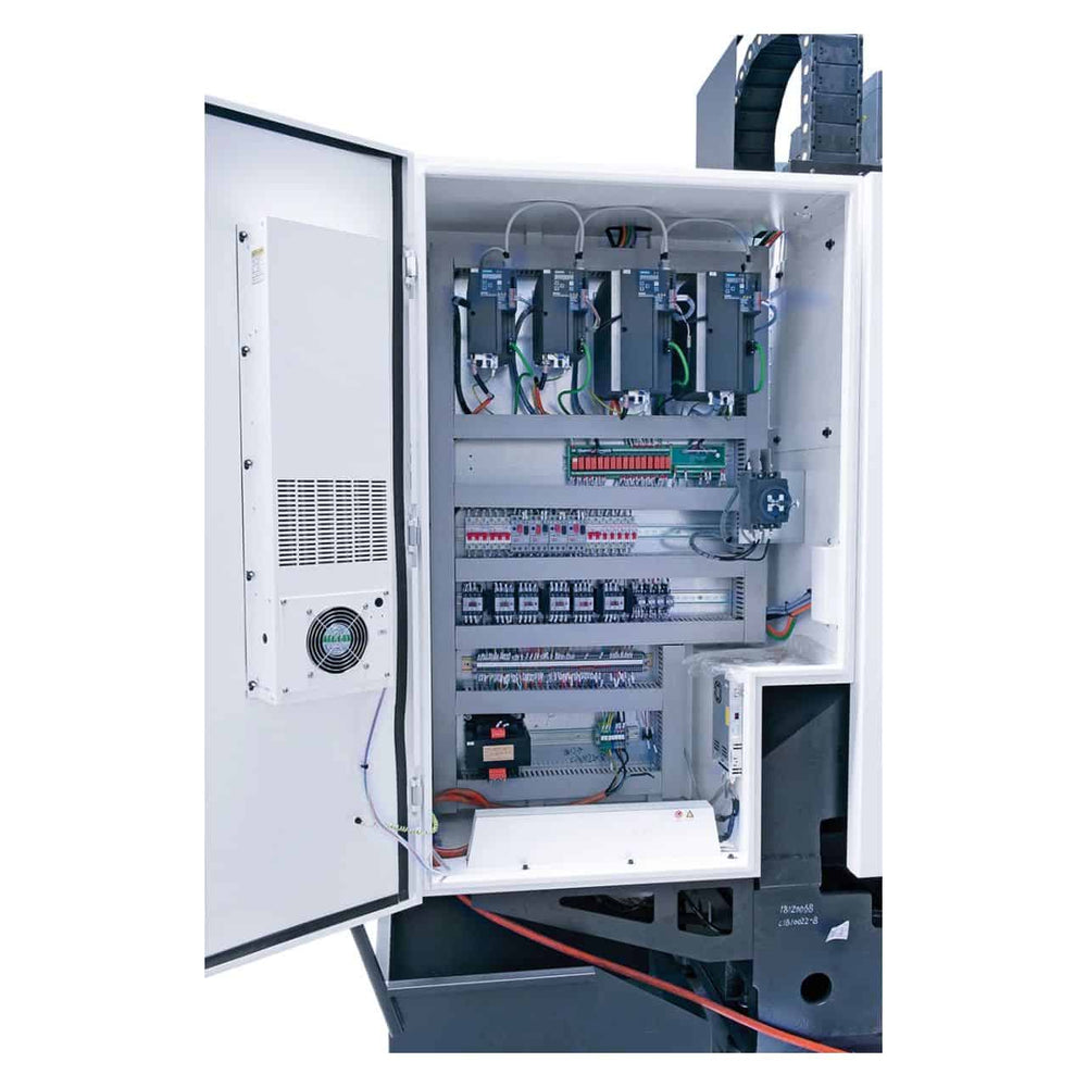 La struttura rigida in ghisa e il banco crociato da 1000 x 500 mm con capacità di carico fino a 500 kg garantiscono stabilità e prestazioni ottimali. L’attrezzatura standard comprende magazzino utensili a carosello da 16 postazioni, trasportatore trucioli a spirale, impianto di refrigerazione, lubrificazione centralizzata e protezioni di sicurezza con cabine chiuse e vetrature in vetro di sicurezza CE.