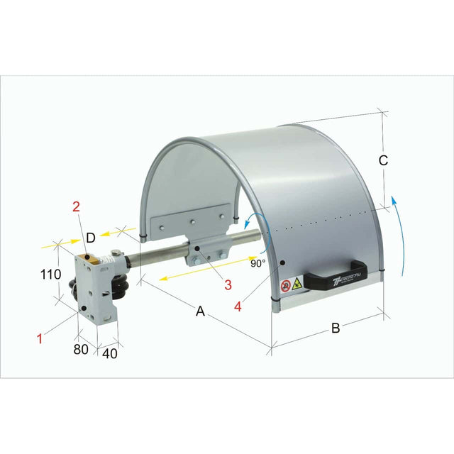 Viene fornito con uno schermo semicircolare monolitico, orientabile in prossimità della testa della macchina, e completo di microinterruttore di sicurezza.