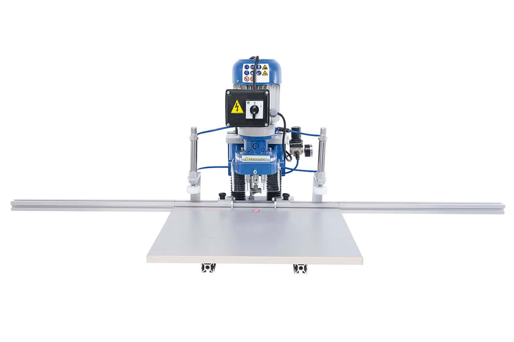 La BBM 35 P è una foratrice professionale con avanzamento pneumatico, progettata per la realizzazione precisa e veloce di fori per cerniere Grass e Blum. Ideale per falegnami e piccole aziende, consente operazioni in serie grazie alla sua guida lunga da 1,5 metri e al bloccaggio pneumatico del pezzo.