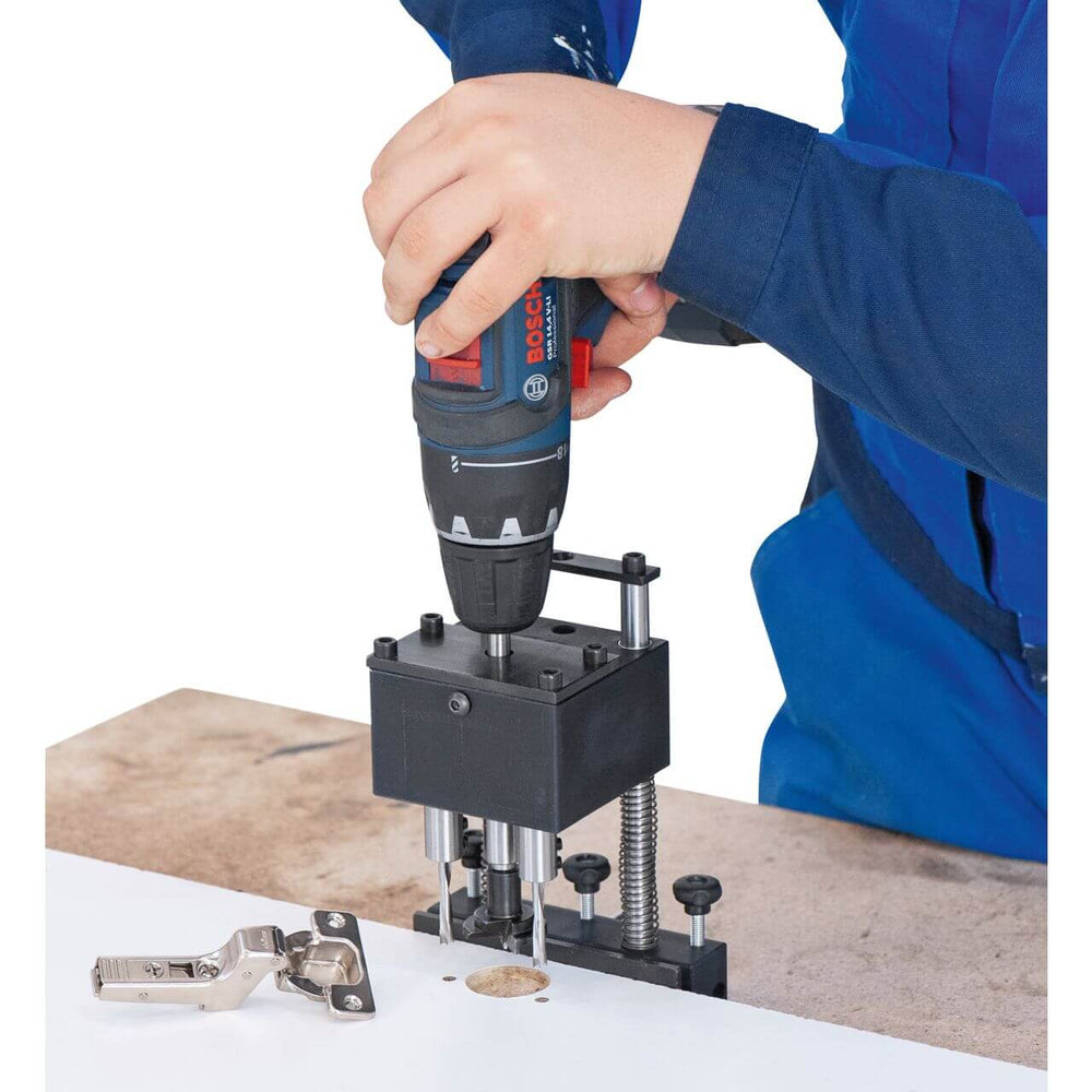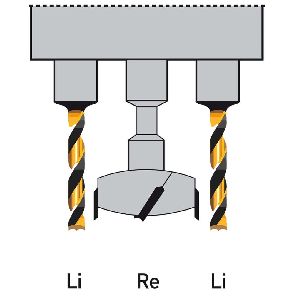 La maschera per la foratura di cerniere di tipo Fiore o di tipo Erba ha tre mandrini ed è adatta all'esecuzione dei tre fori per il fissaggio delle cerniere contemporaneamente.