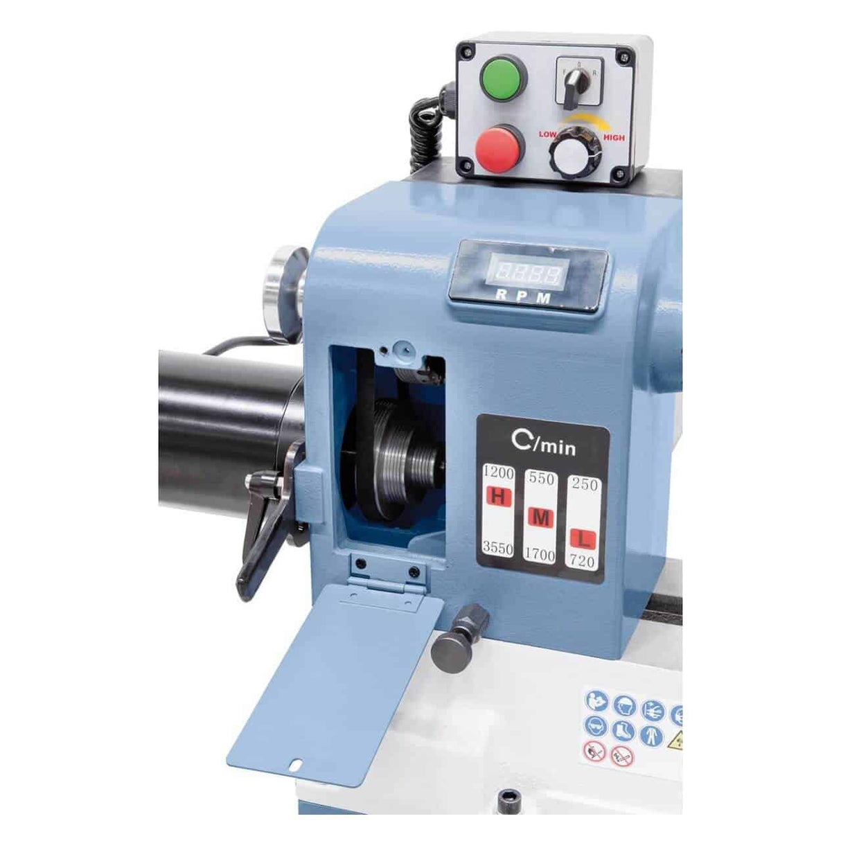 Il tornio dispone di un sistema elettronico con regolazione continua della velocità su 3 intervalli, da 250 a 3550 rpm, per un controllo preciso su ogni lavorazione.