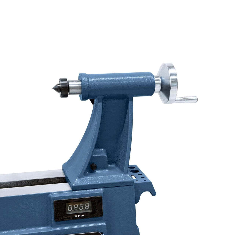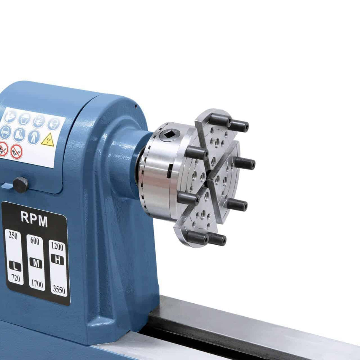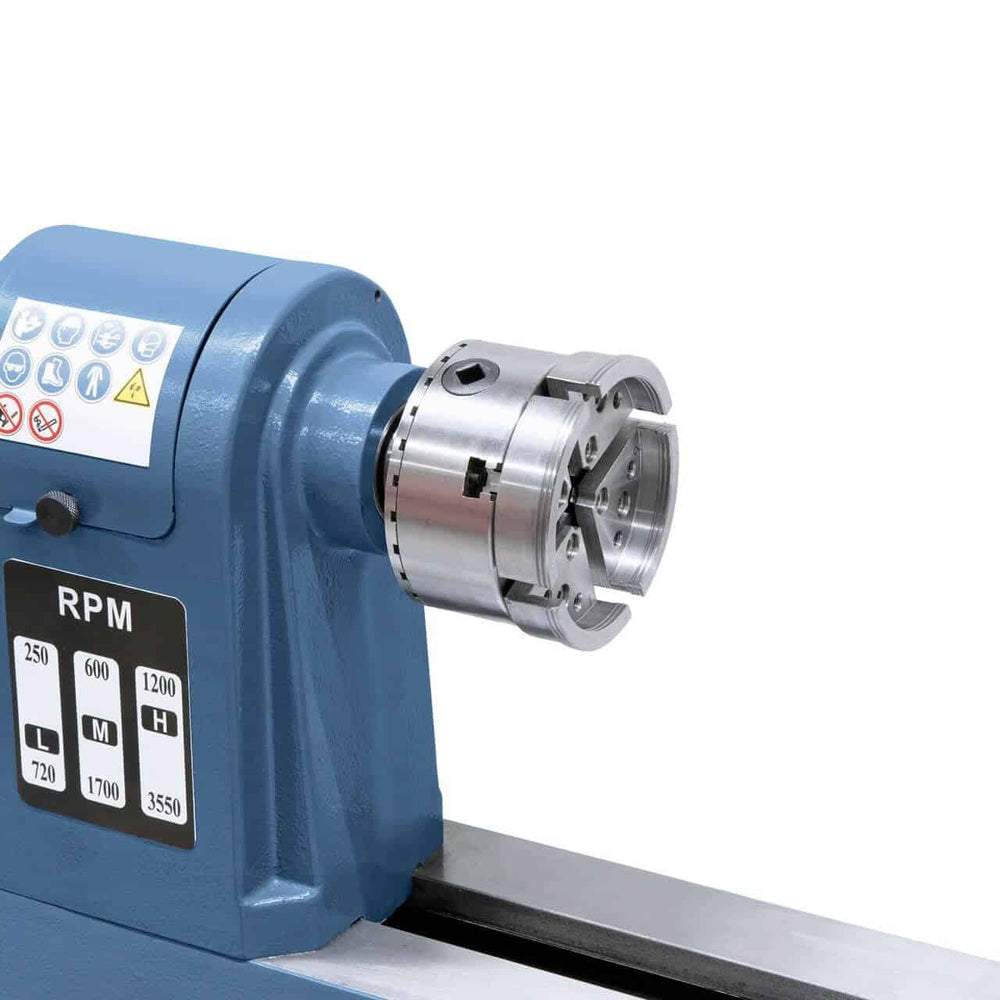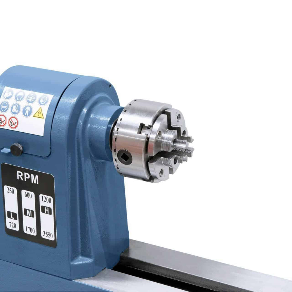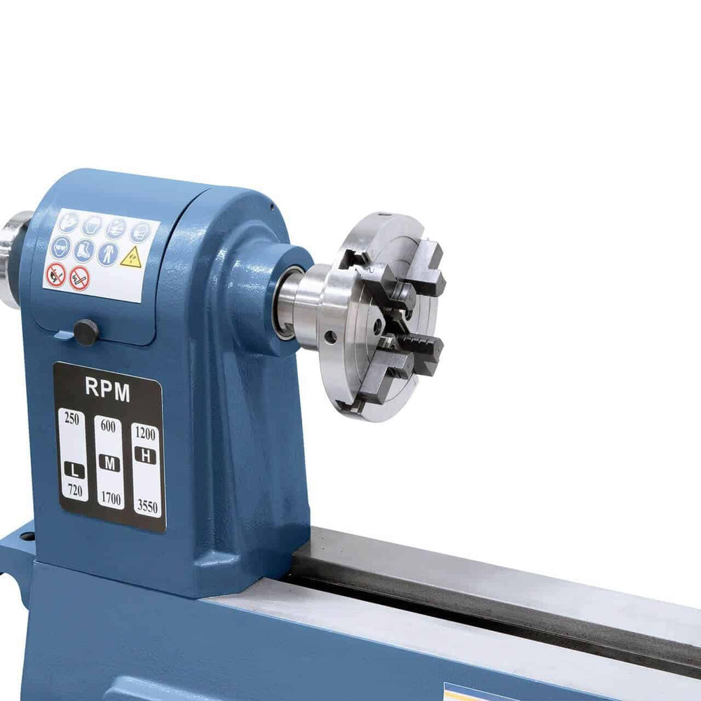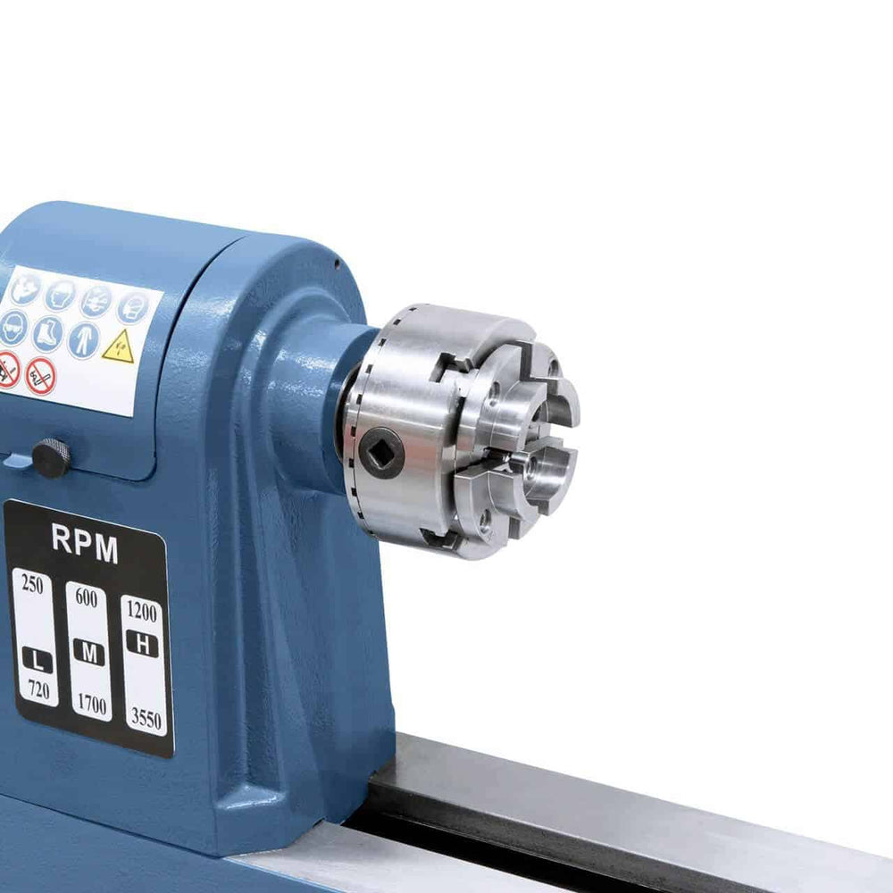 Il tornio include poggiattrezzi da 200 mm, piastra frontale da 100 mm, contropunta rotante MT2, due punte trascinatrici da 25 mm, display LED, regolazione continua della velocità e utensili.