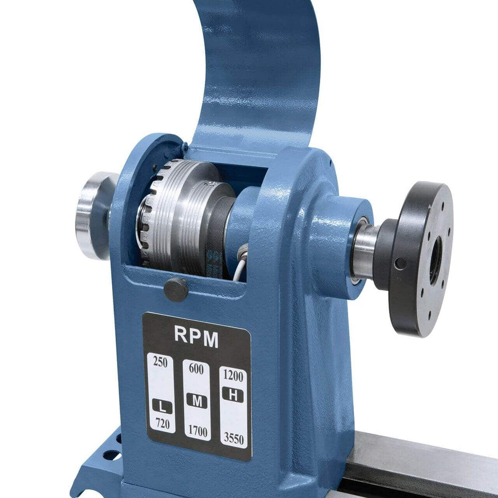 Il tornio VDM 500 dispone di una regolazione continua della velocità tramite inverter, con tre gamme selezionabili: bassa (250–720 rpm), media (600–1700 rpm), alta (1200–3550 rpm).
