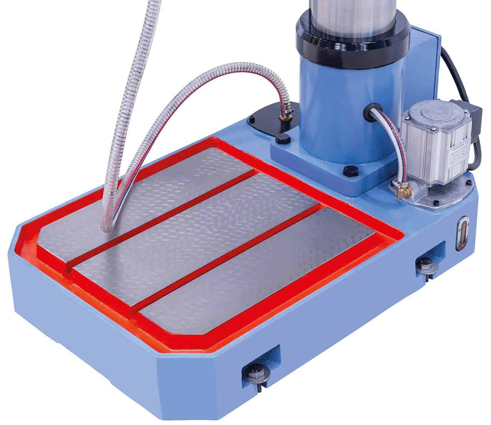 La macchina dispone di 6 avanzamenti automatici controllati da frizione elettromagnetica, motorizzazione per la regolazione in altezza della tavola e cambio a due stadi per una gamma di velocità da 50 a 2200 giri/min. Il tavolo in ghisa massiccia, trattato superficialmente, è inclinabile da -45° a +45° e permette il fissaggio di pezzi di grandi dimensioni grazie alle cave a T.